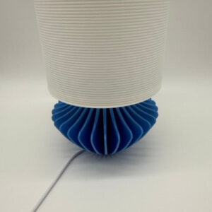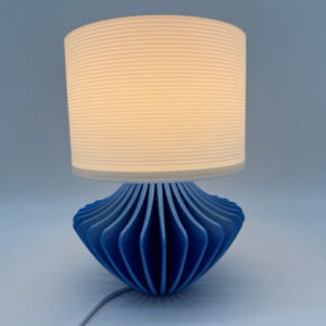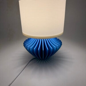 Bring a fresh and modern look to your interior with this designer table lamp . The lamp combines a striking blue geometric base with a sleek white ribbed shade , making it both stylish and timeless. The warm light diffused by the shade instantly creates a cozy atmosphere in any room.